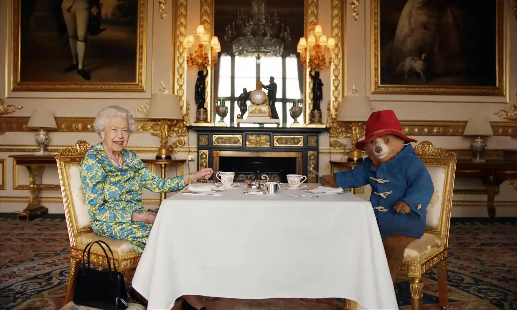 패딩튼 베어와 크림 티를 함께 마시는 여왕
