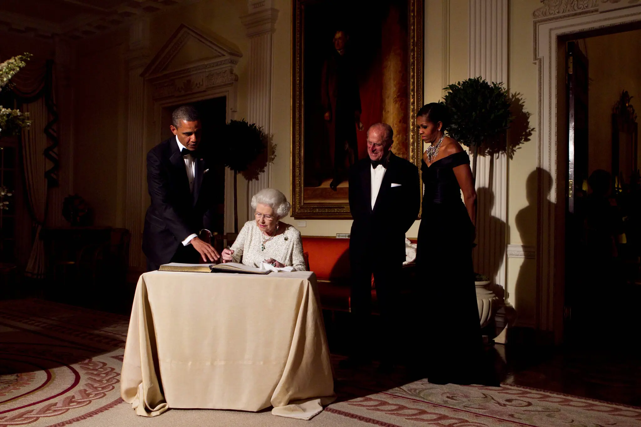 트럼프 대통령과 버킹엄 궁전의 이스트 갤러리에서 열린 만찬회로 이동하는 여왕