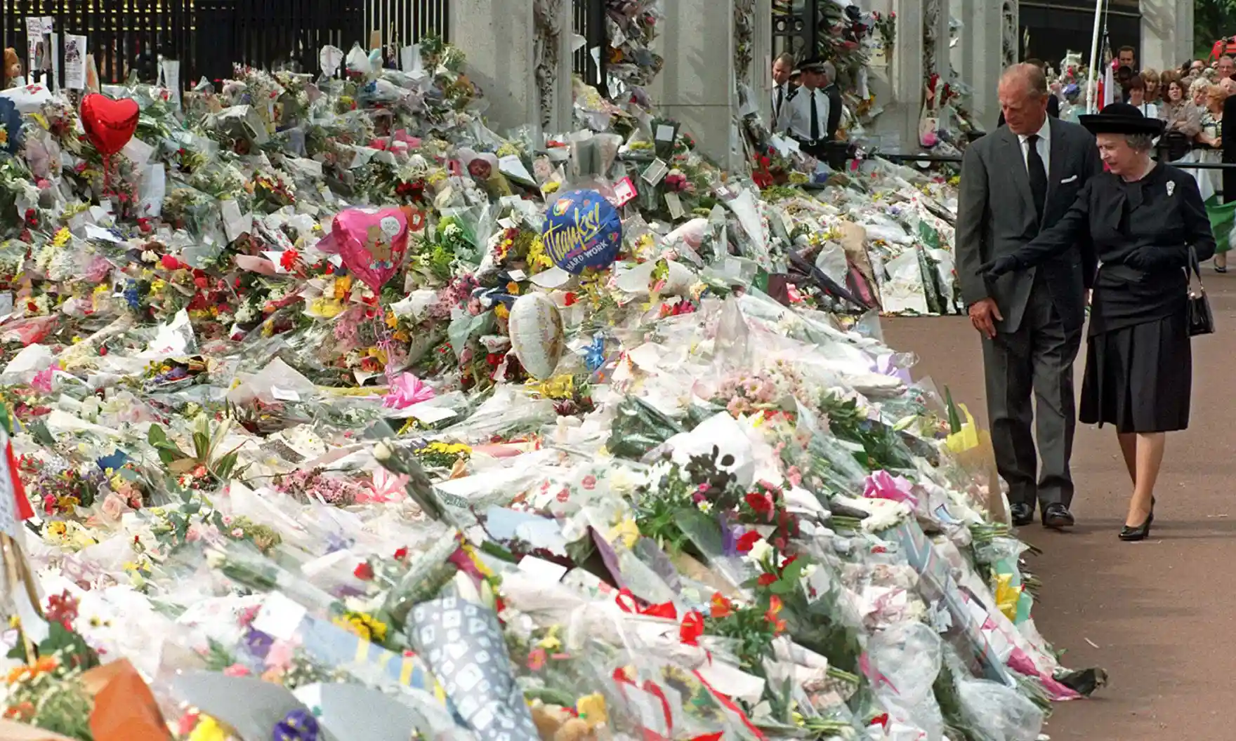 다이애나 왕세자비의 죽음을 애도하는 사람들이 놓고 간 헌화들을 둘러보고 있는 여왕과 필립