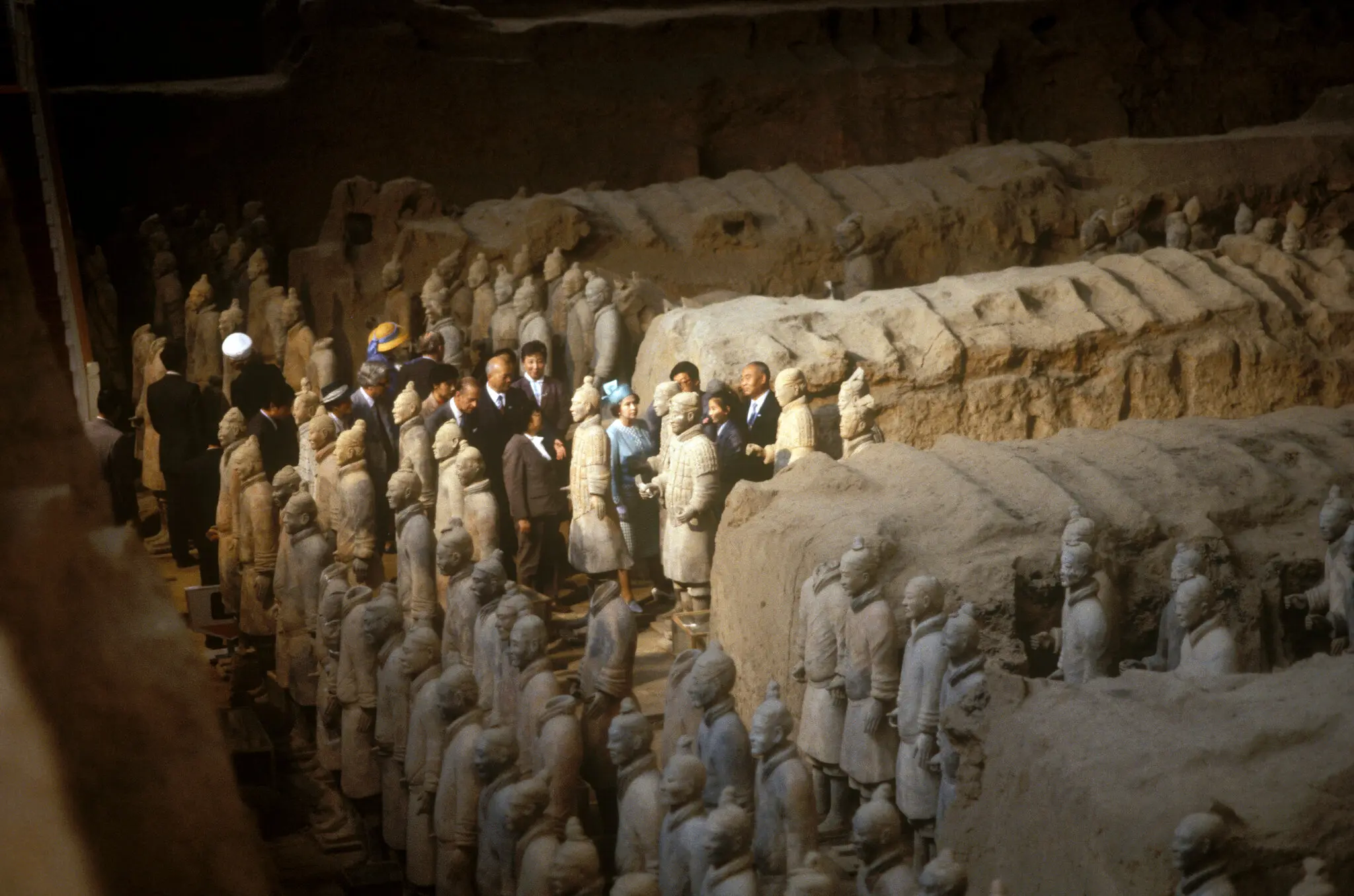중국 시안의 발굴된 테라코타 군대를 관람하는 여왕