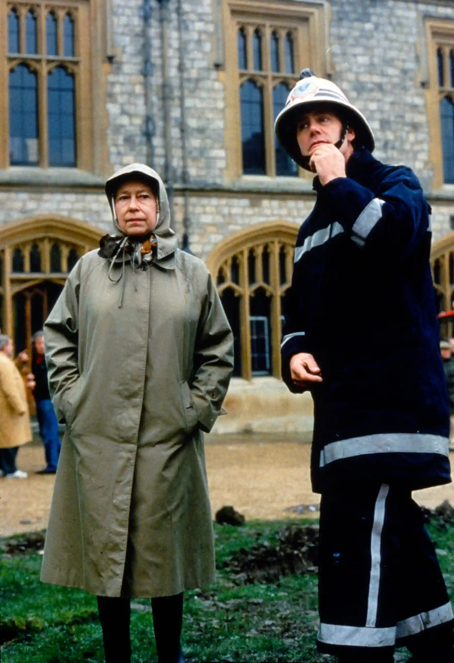 여왕과 소방관이 윈저 궁에 발생한 화재의 피해 상황을 점검하고 있다.