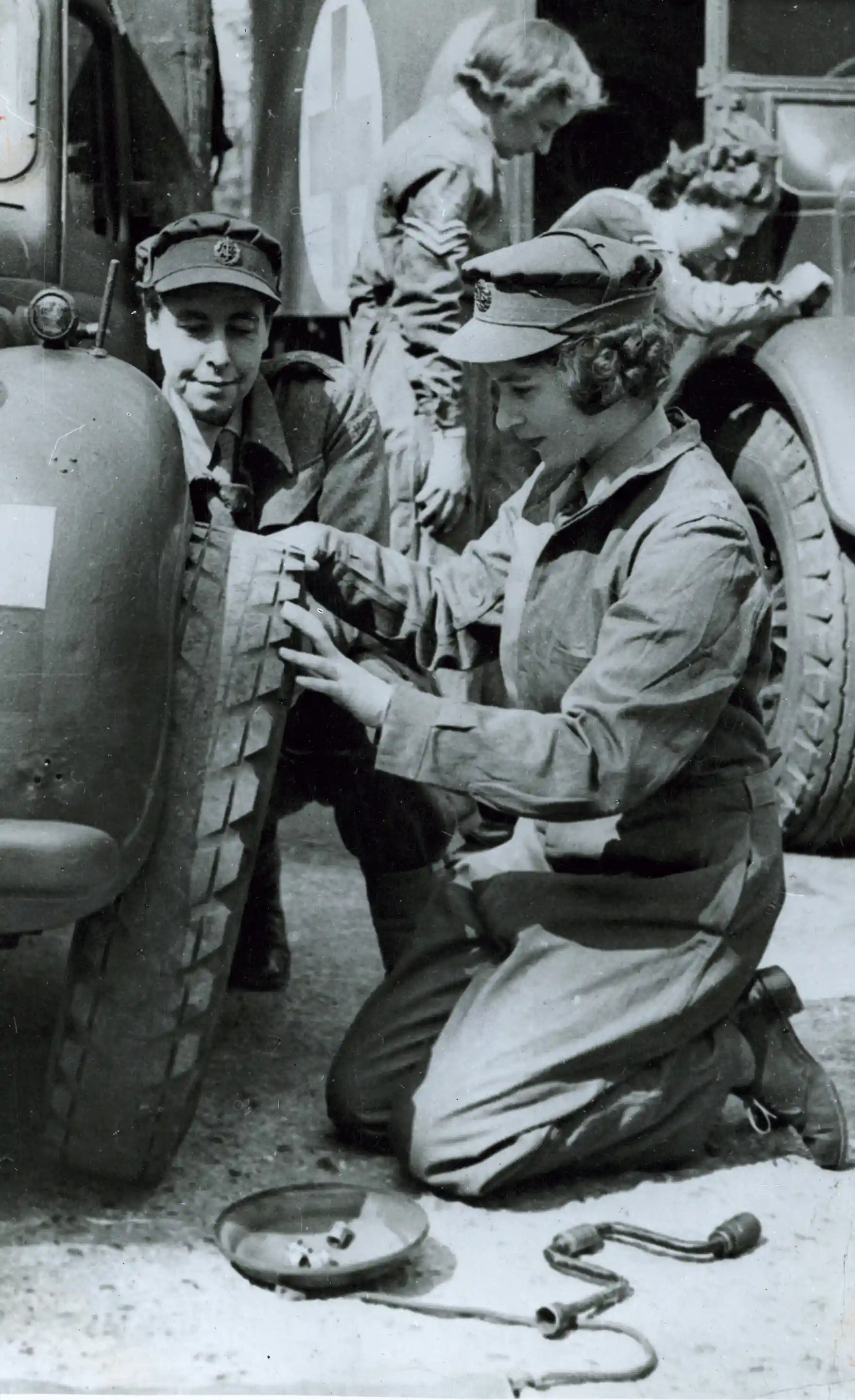 2차 세계 대전 중에 ATS 멤버로 트레인을 받던 중에 트럭의 타이어를 바꾸고 있다.