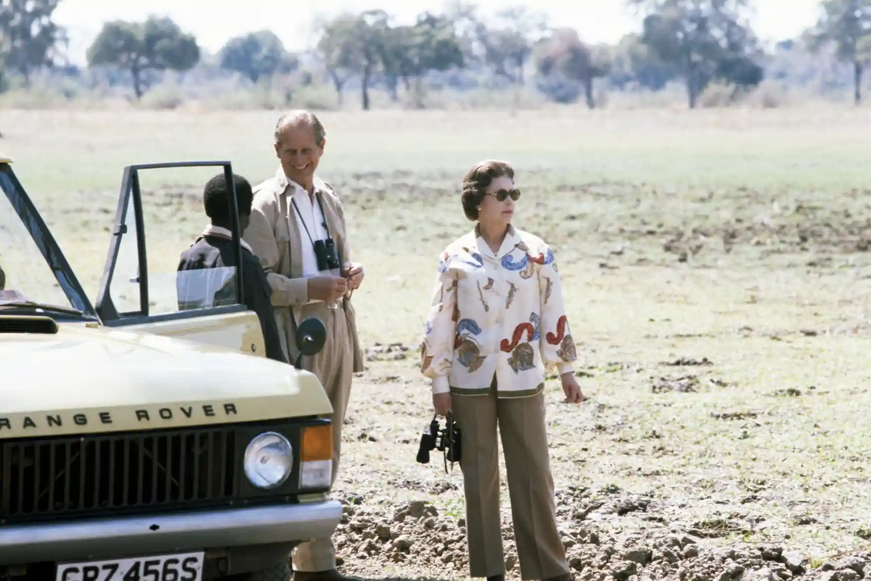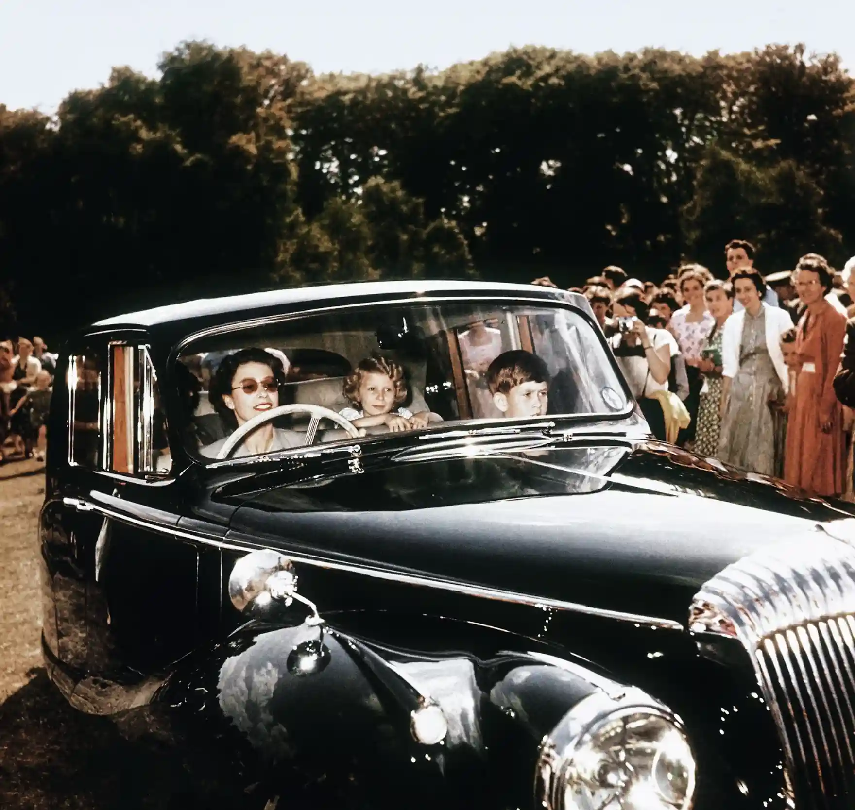 찰스 왕자와 앤 공주를 태우고 운전을 하는 엘리자베스 여왕