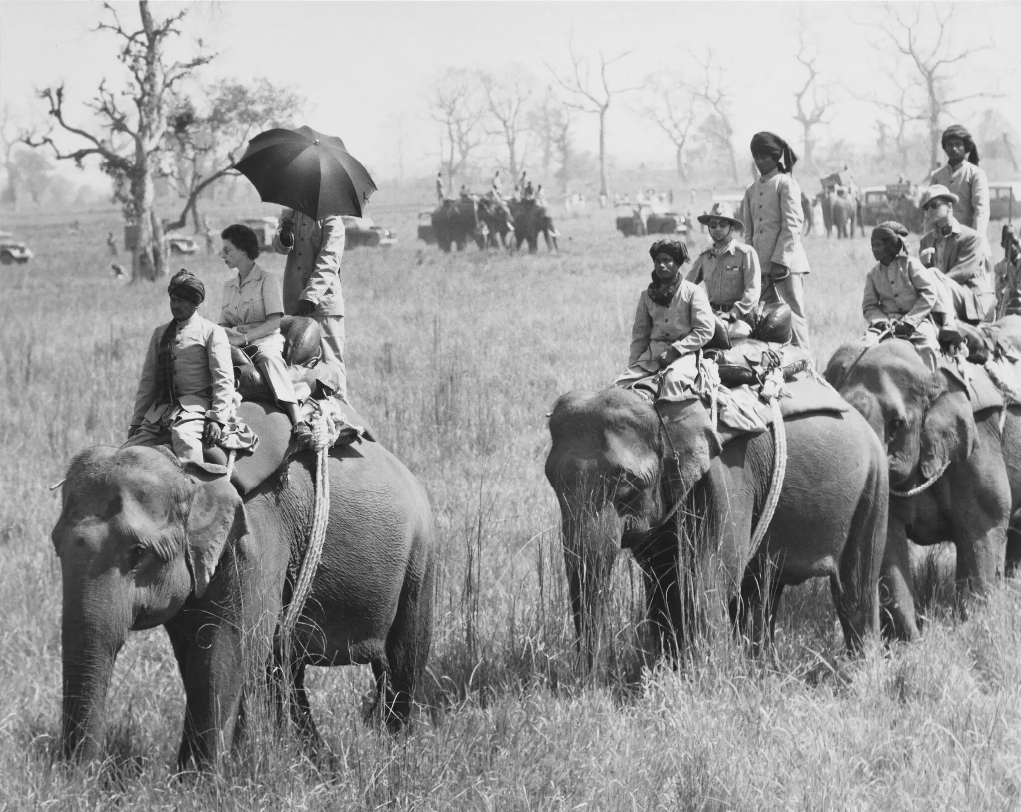 네팔 방문 중에 코끼리를 타고 호랑이 사냥에 참가한 엘리자베스.