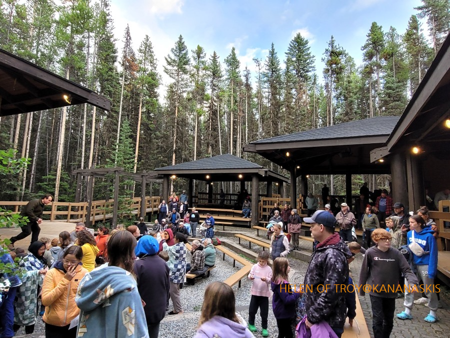 극장 주위에 캠핑을 온 가족들이 걷거나, 자전거를 타고 혹은 차를 타고 온
