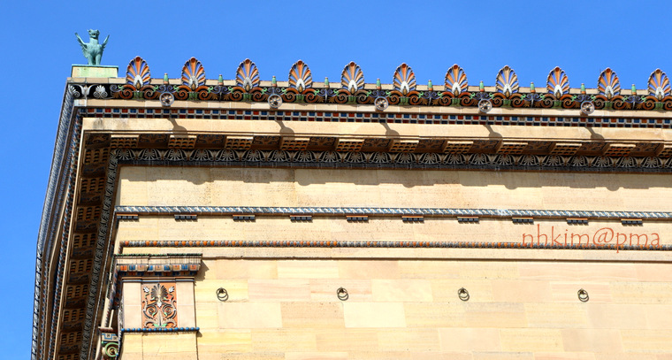 미술관 입구와 기둥 위 페디멘트와 건물에 사용된 암석의